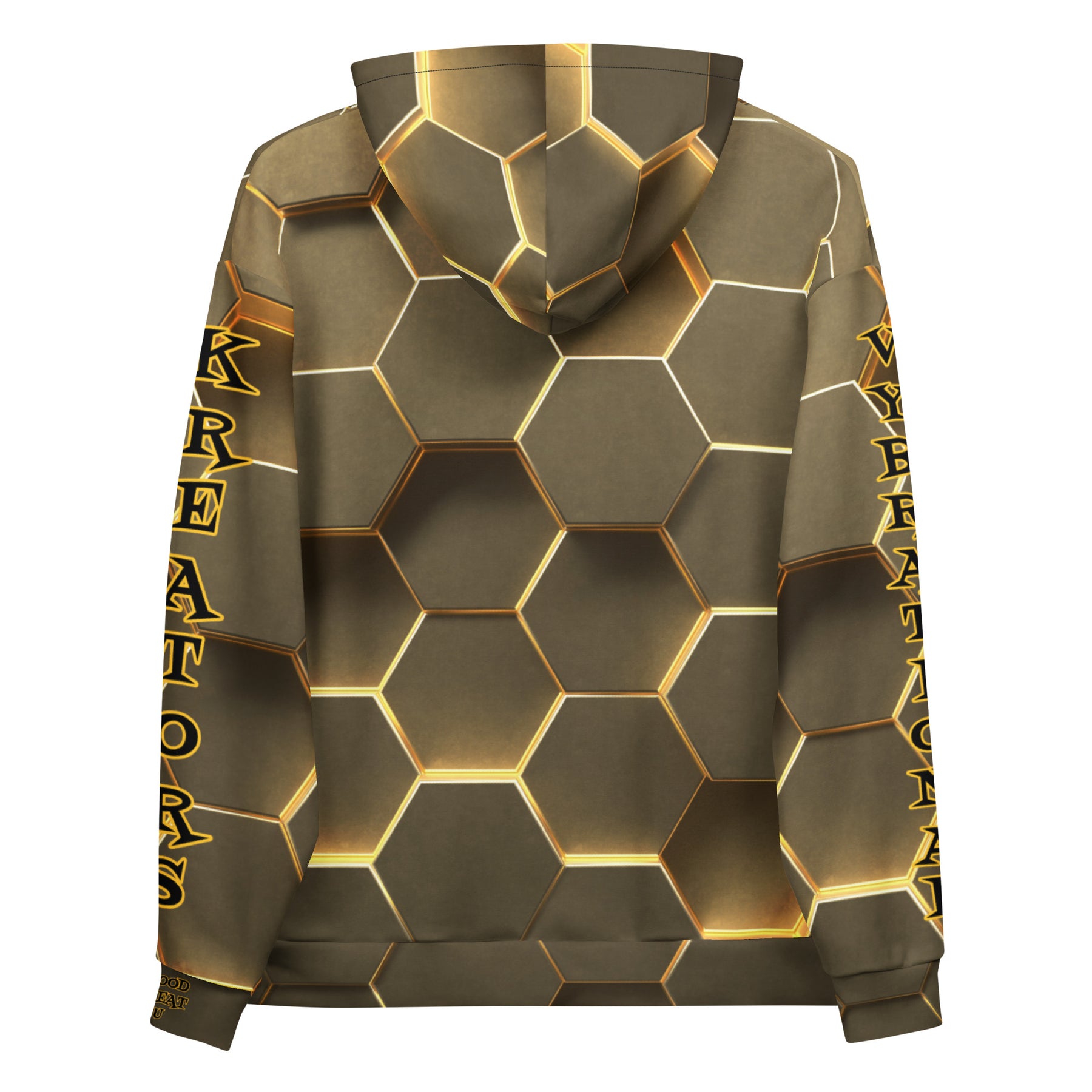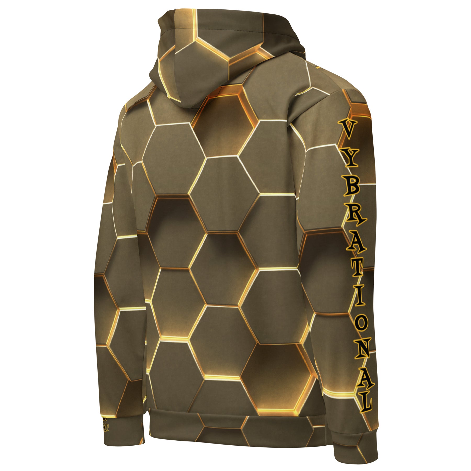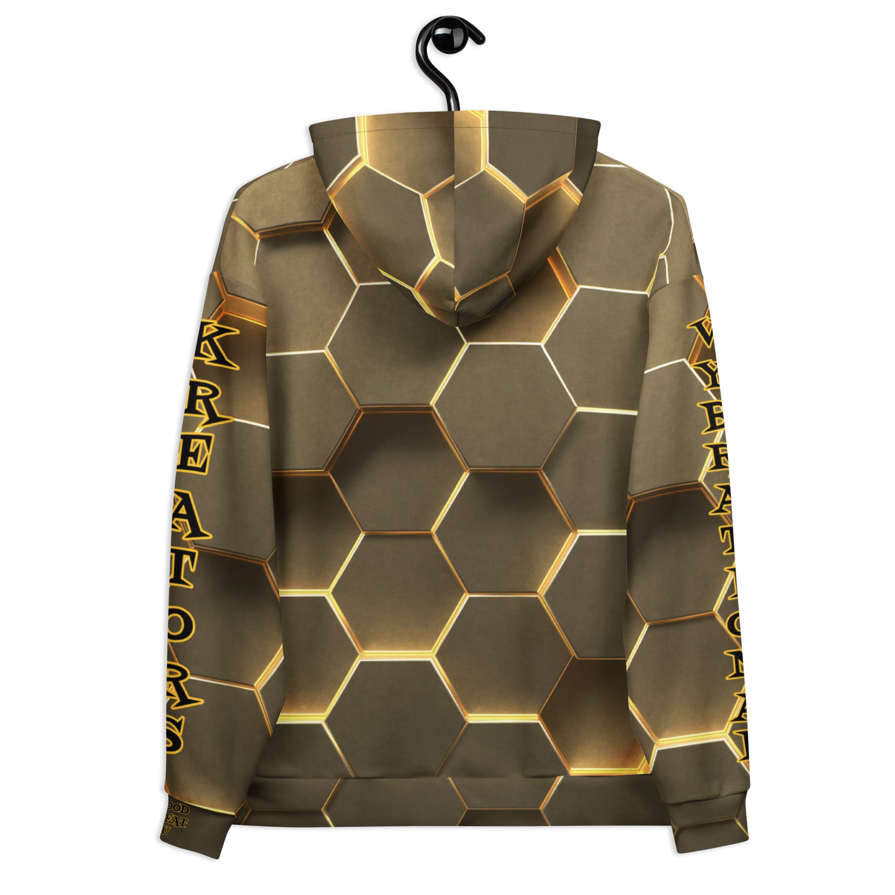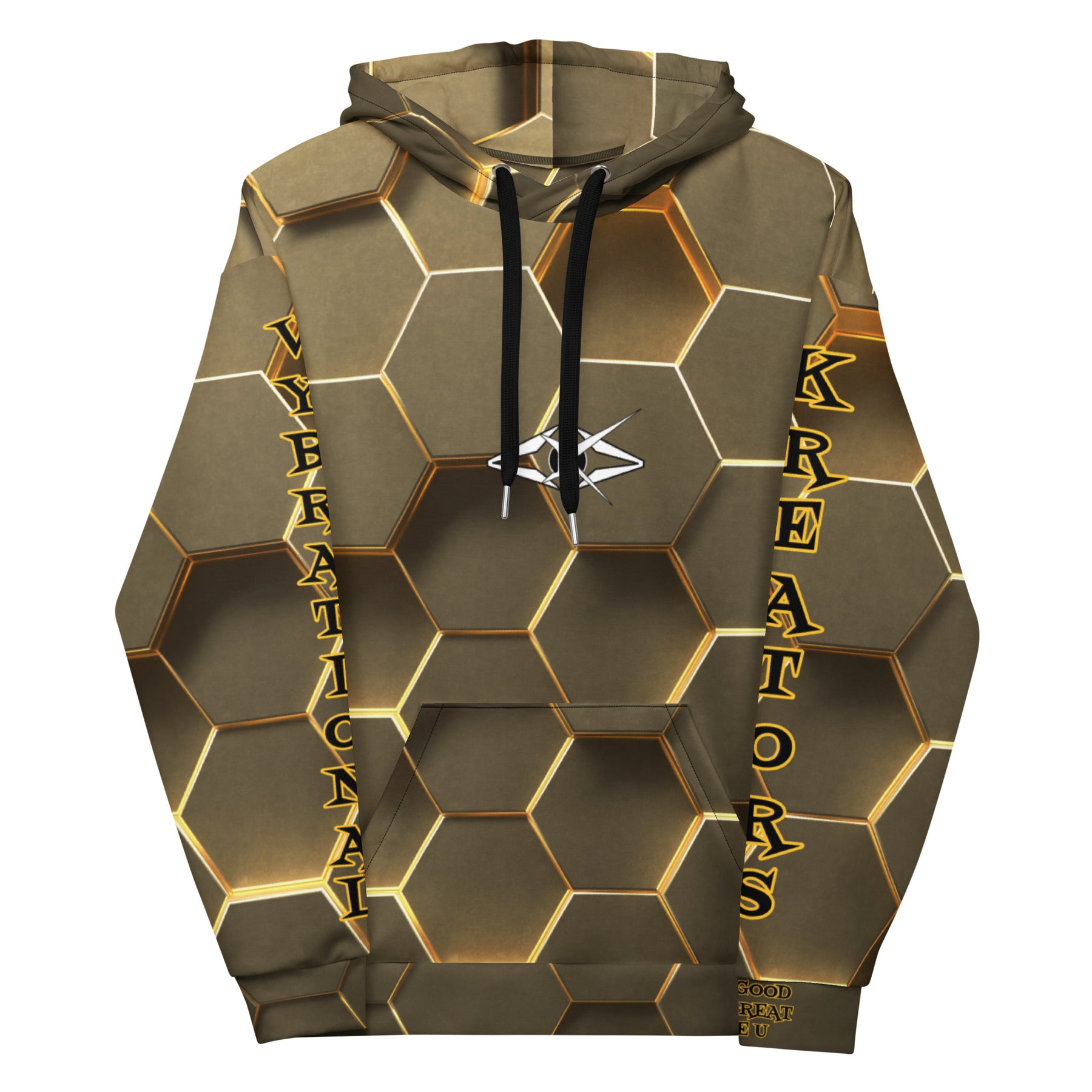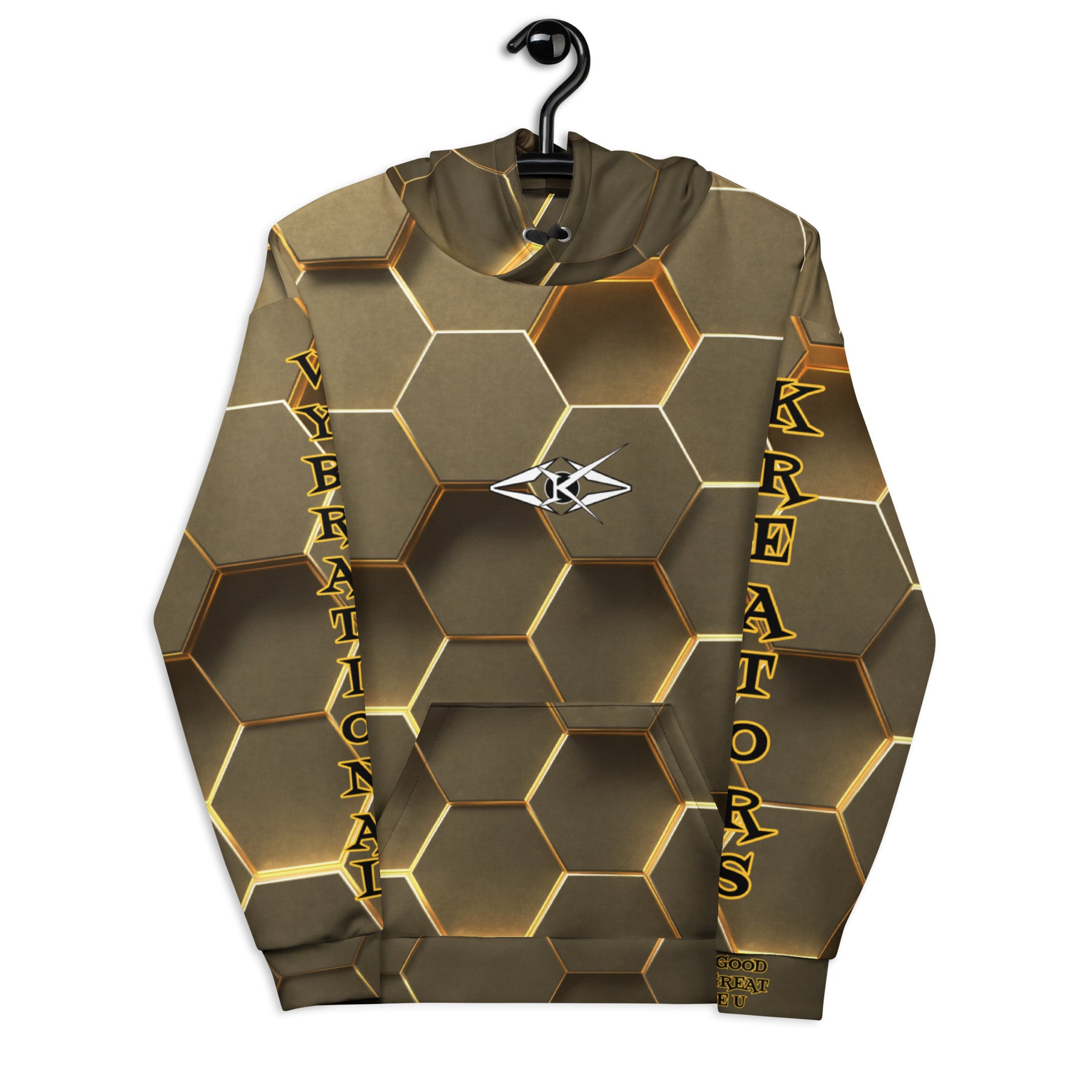 The Gold Hexa Luxe Hoodie by Vybrational Kreators is where opulence meets everyday comfort. Crafted from a premium cotton-polyester blend, this hoodie combines the soft, breathable qualities you love with a sophisticated, luxurious design. Featuring a striking gold honeycomb pattern across the fabric, this hoodie is a bold statement piece that adds a touch of grandeur to your casual wardrobe. The rich texture and metallic sheen give it a high-end, elevated look, perfect for those who want to make a statement while staying comfortable.