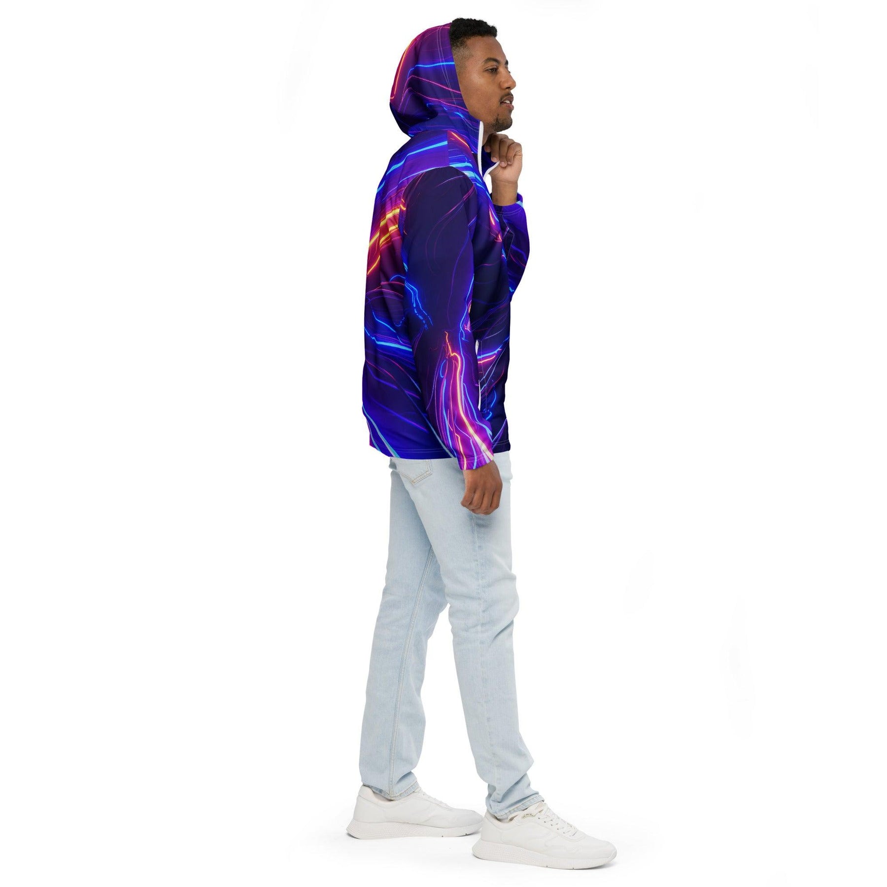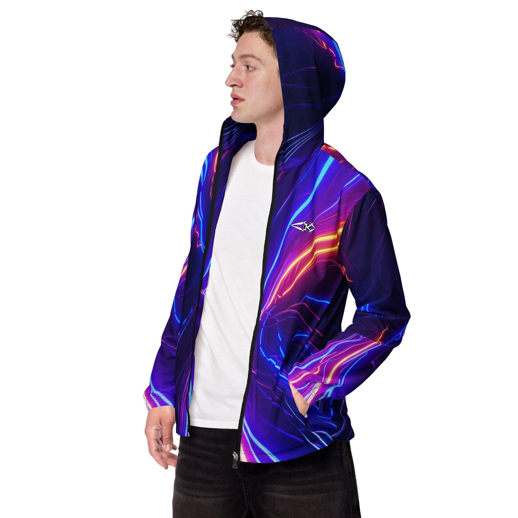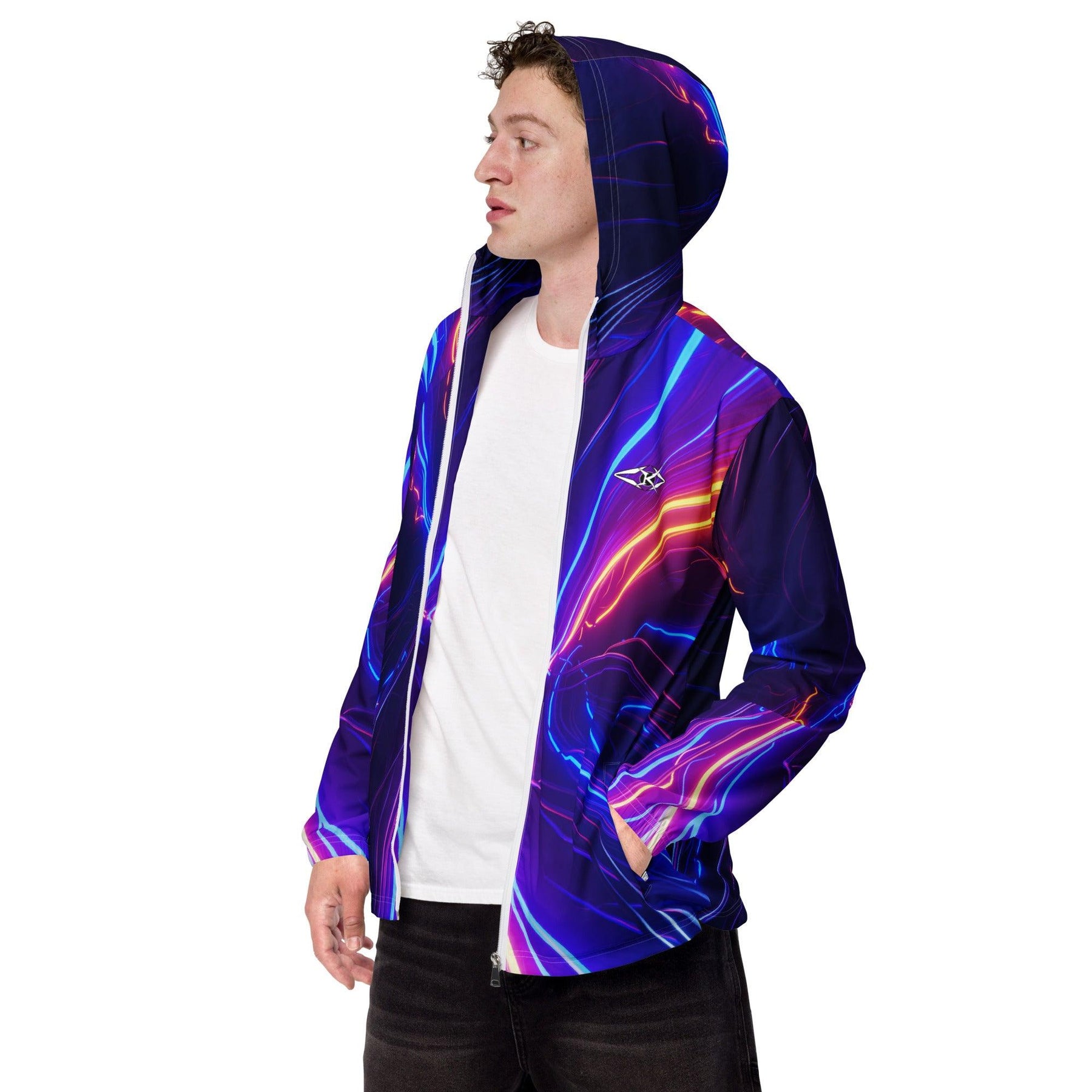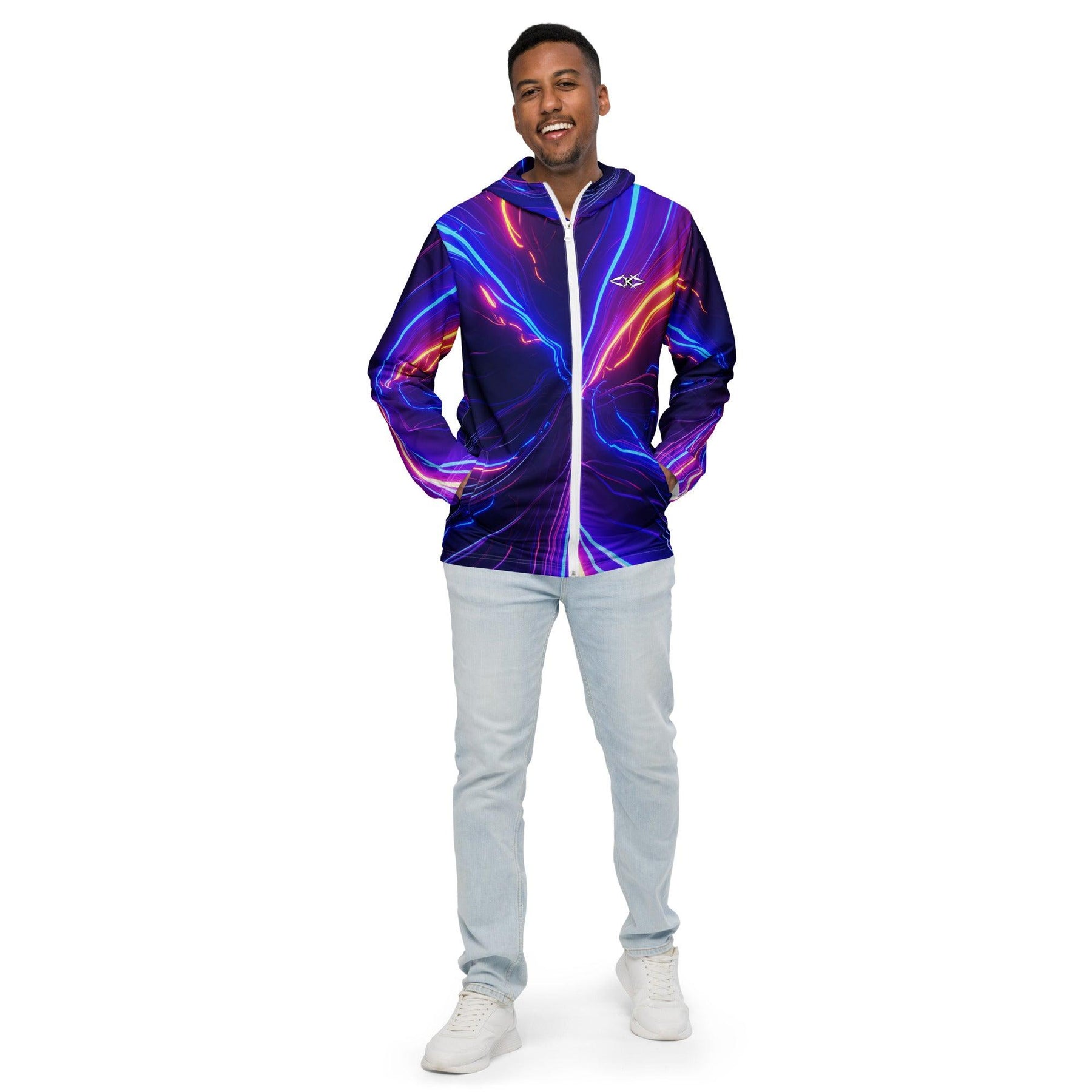 Shop the Vybrational Kreators Luxe Luminous Fury Windbreaker. A premium, weather-resistant jacket with a dynamic gradient design, adjustable hood, and tailored fit for ultimate luxury and style.