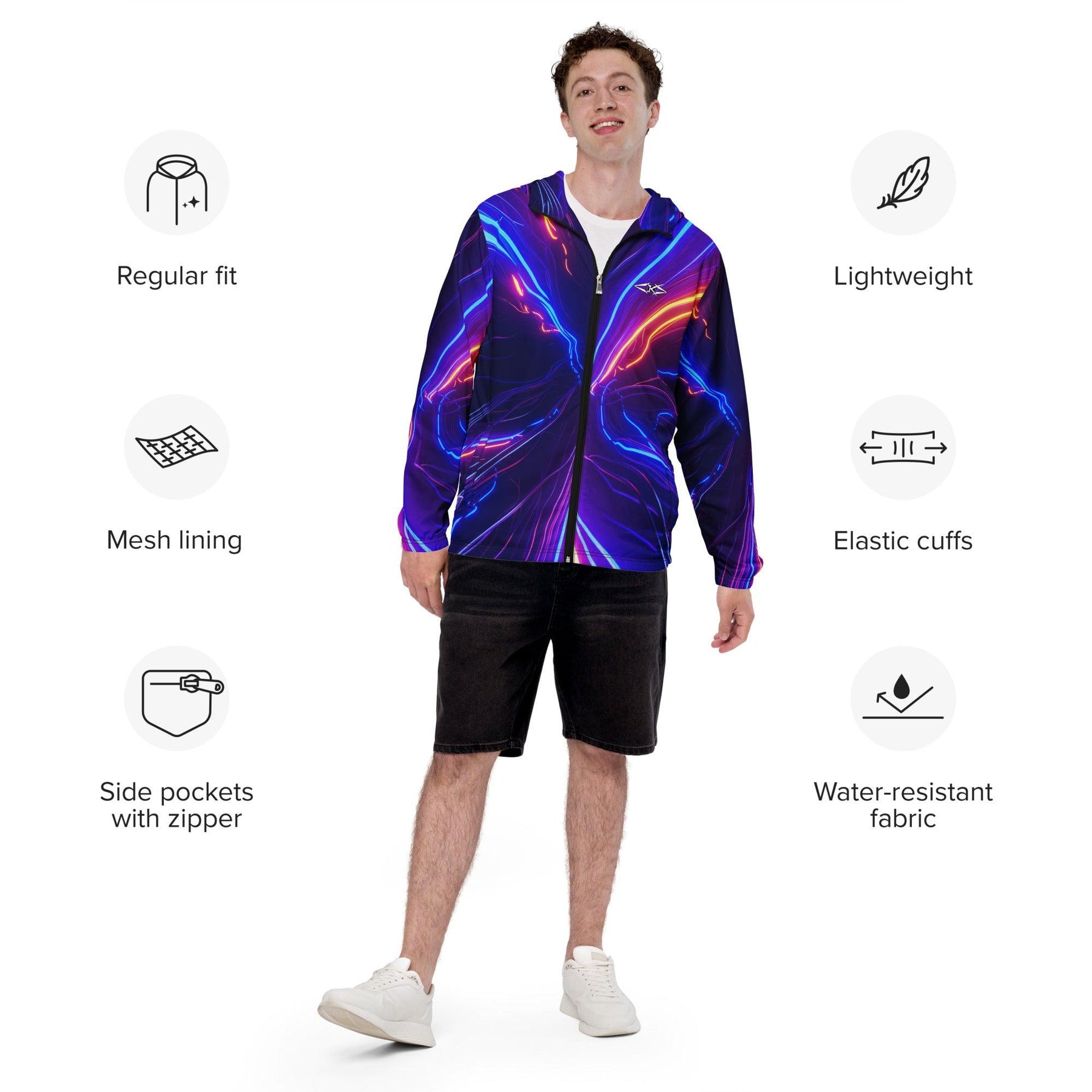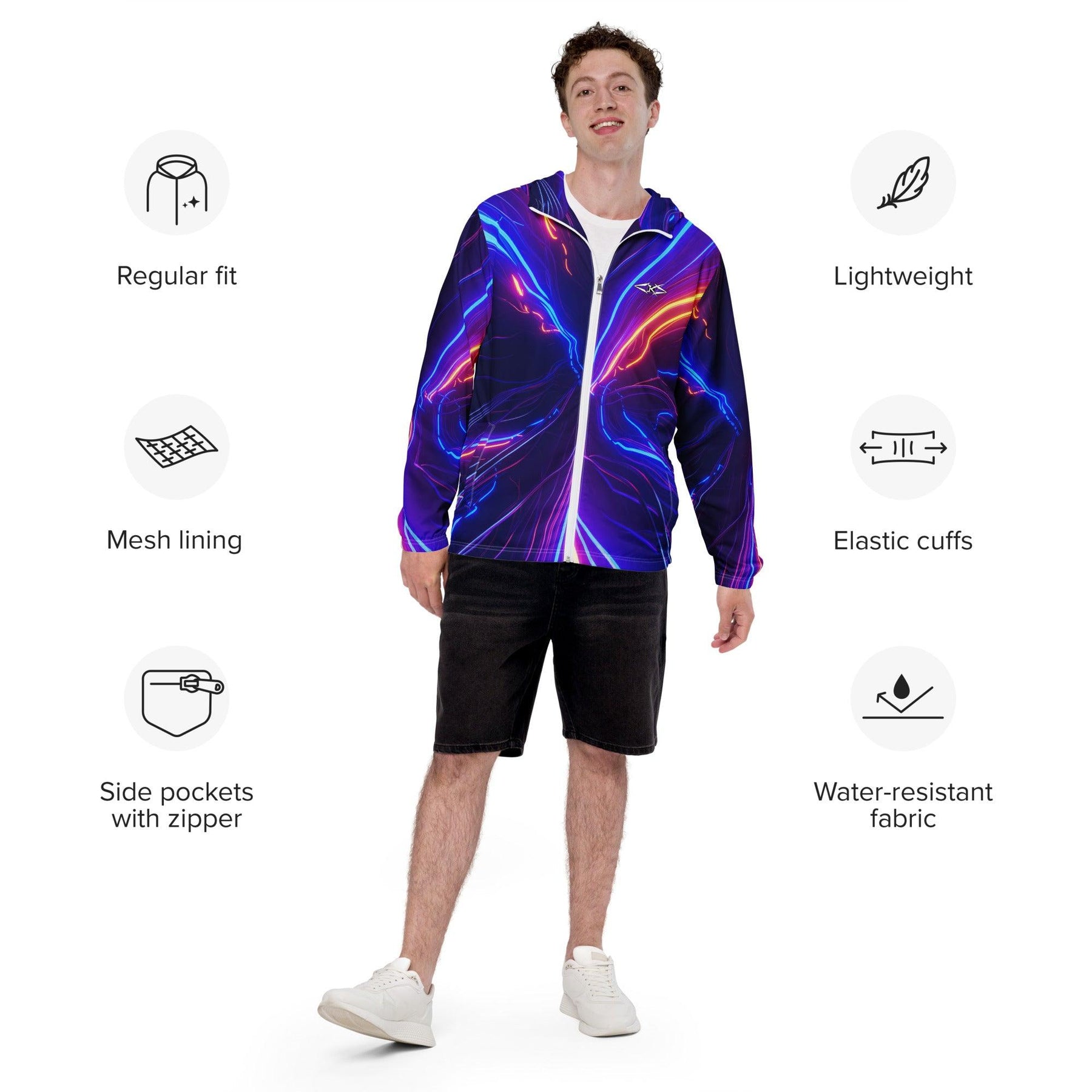 Crafted from premium, weather-resistant fabric, the Luxe Luminous Fury Windbreaker offers both lightweight comfort and robust protection against the elements. Its innovative design features a striking color gradient that shifts from fiery tones to cool, crisp shades, symbolizing the intensity and beauty of nature’s power. The full-zip front offers customizable ventilation, while the adjustable drawstring hood ensures a snug fit that shields you from wind and rain. Ribbed cuffs and hem provide a tailored finish, ensuring a flattering fit that moves with you.
