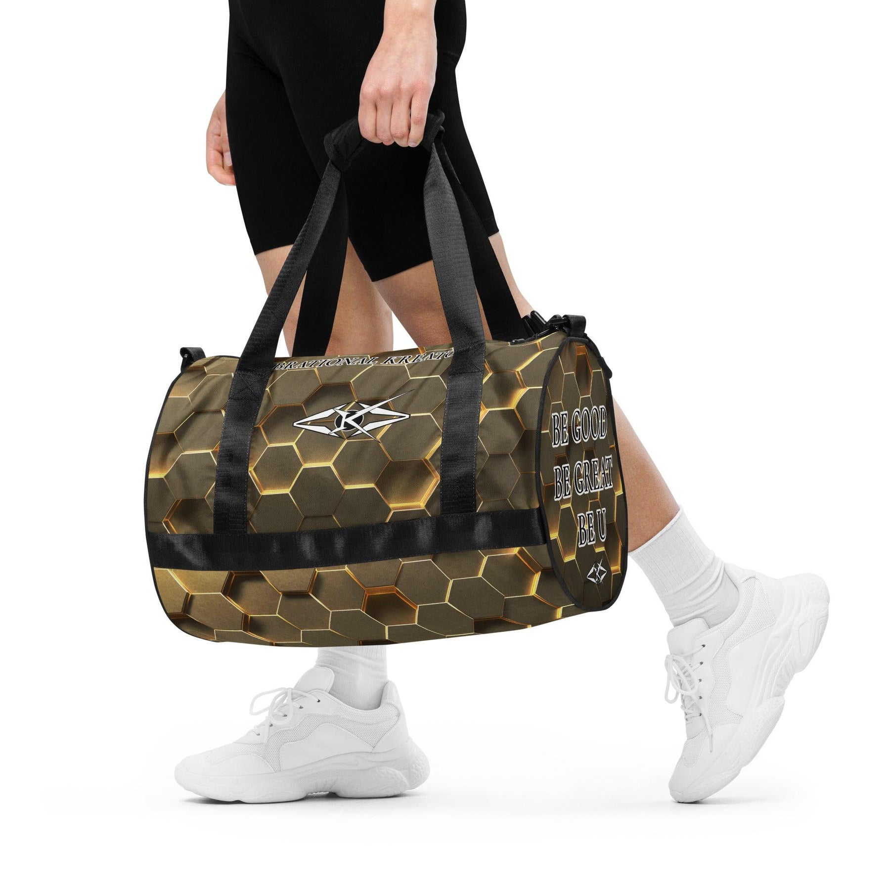 Introducing the Gold Hexa Luxe Mini Duffel by Vybrational Kreators, where premium craftsmanship meets exceptional functionality. Designed for those who demand both style and practicality, this mini duffel bag is crafted from 100% durable polyester, ensuring a long-lasting, water-resistant finish. The unique gold honeycomb design adds an exclusive, luxurious touch, making it a standout accessory for both everyday use and travel.
