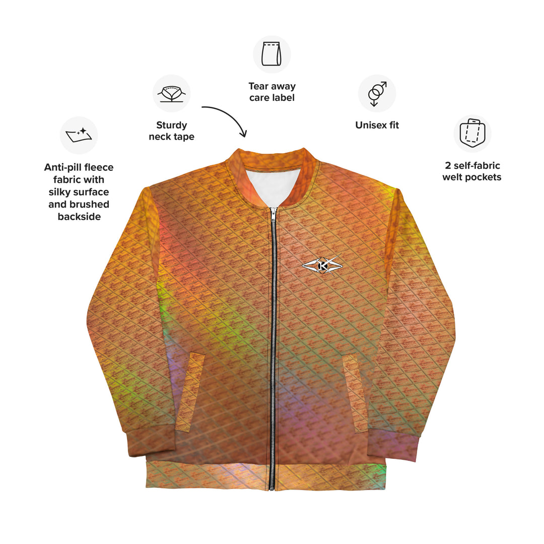 The Vybrational Kreators Luxe Aurelia Prism Bomber Jacket is a bold exploration of luxury, design, and individuality. Combining an exceptional color spectrum with premium craftsmanship, this bomber jacket brings an artistic twist to a timeless classic. The intricate color interplay and dynamic design make the Aurelia Prism Bomber Jacket a standout piece for those who seek sophistication with an edge.