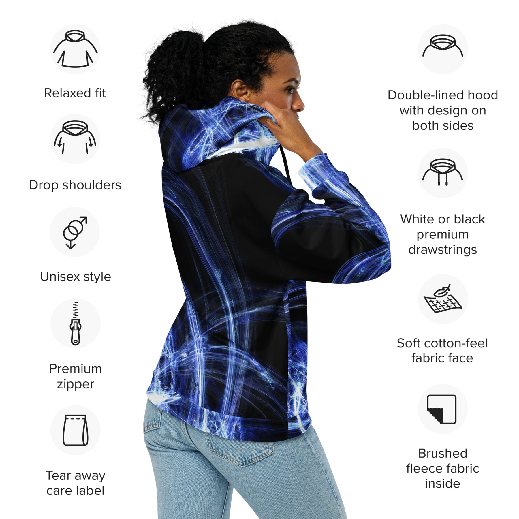 • Premium drawstrings and zipper with metal details