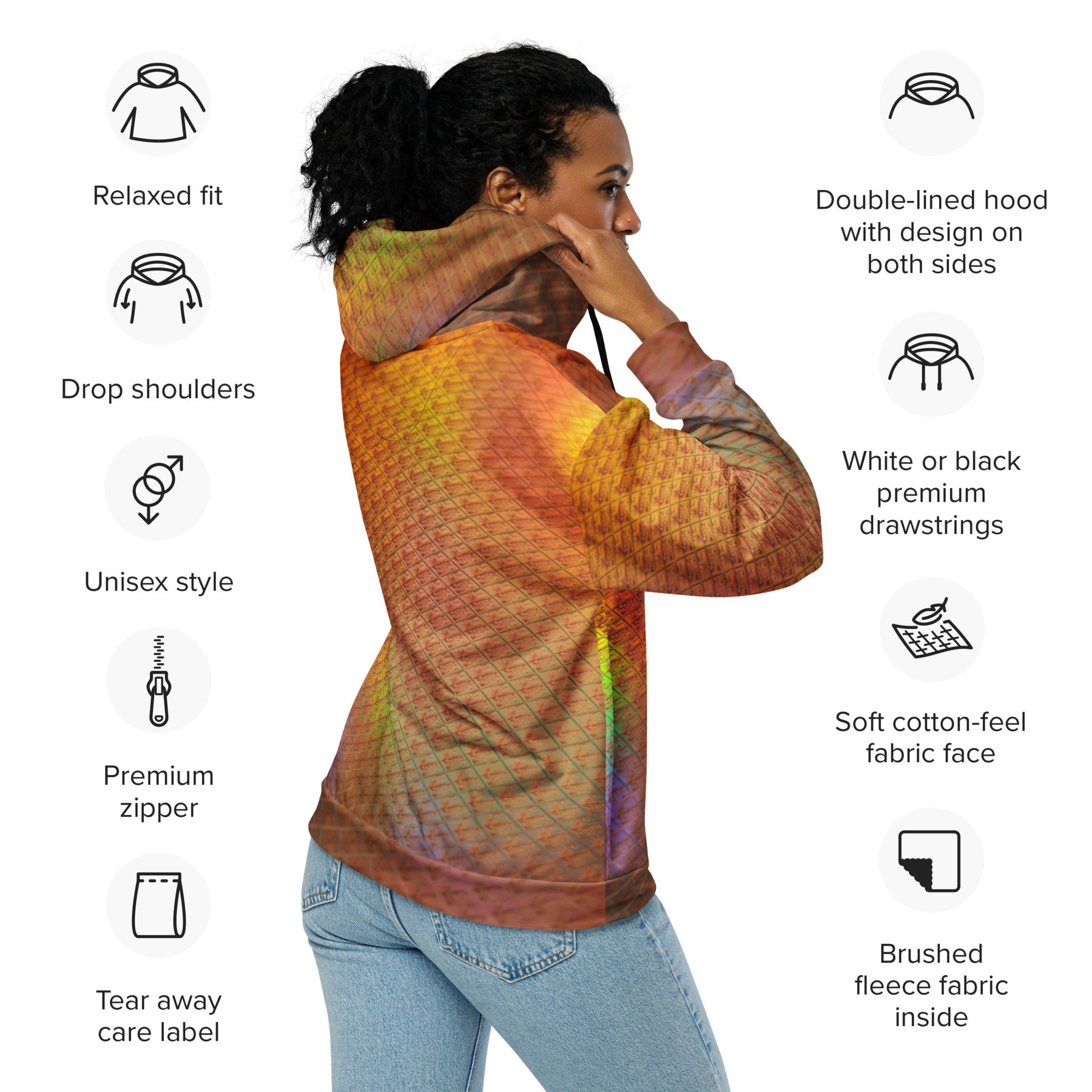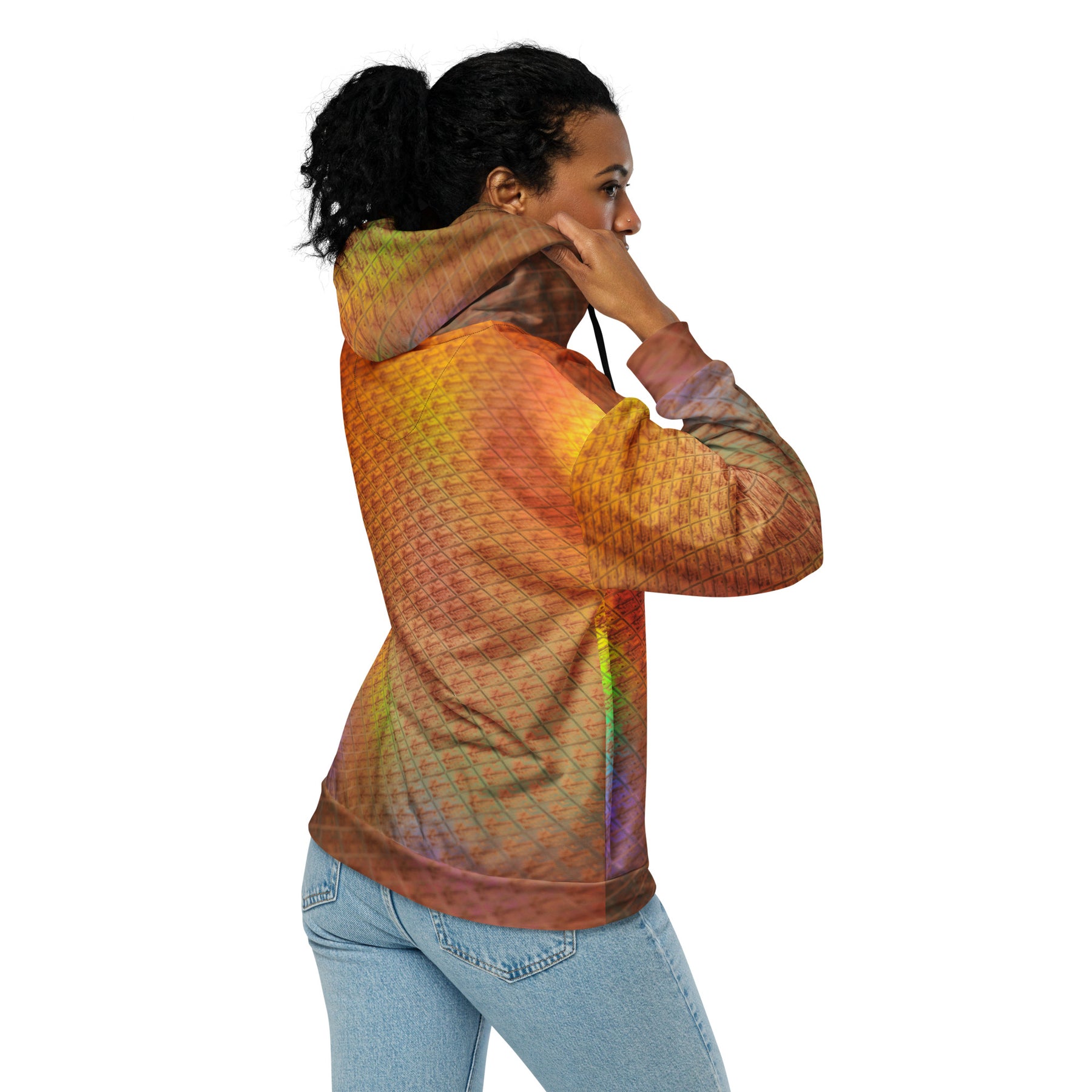 Crafted from a premium blend of materials, the Luxe Aurelia Prism Zip-Up Hoodie offers a soft, cotton-feel exterior, while the brushed fleece interior provides warmth and unparalleled comfort. The full-zip design offers convenience and versatility, allowing you to adjust your look while adding an extra layer of modernity. Ribbed cuffs and hem give it a tailored fit, while the adjustable drawstring hood adds functionality and personal comfort. The stunning prismatic color scheme across the front and back makes a bold yet refined statement, embodying both luxury and innovation.