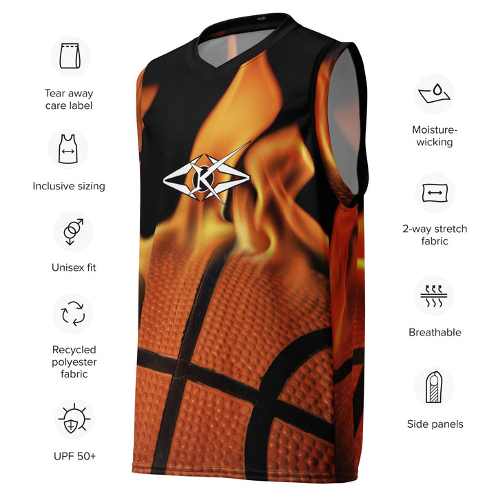The bold flame design takes center stage, symbolizing strength and determination, while the subtle Vybrational Kreators logo is embroidered for an added touch of exclusivity. Whether you're on the court, at the gym, or hitting the streets, the Blaze Court Jersey guarantees you'll stand out in style, combining performance with luxury.